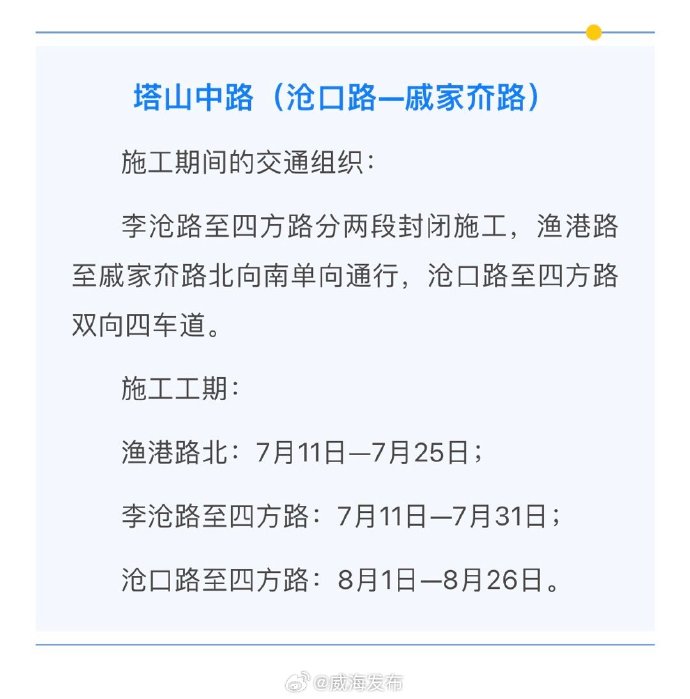 7月11日至8月26日,塔山中路(滄口路-戚家夼路)施工提醒