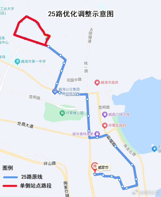 威高花園樞紐站改為途經(jīng)站,調(diào)整后,25路改為戚家夼環(huán)行運行,由戚家夼發(fā)車,按原線運行至威高時光城站點后,改行宮松嶺路、遠(yuǎn)遙墩路、臥龍山路、宮松嶺路按原線路返回戚家夼站點。威高花園區(qū)域站點調(diào)整為單側(cè)??俊?/p>