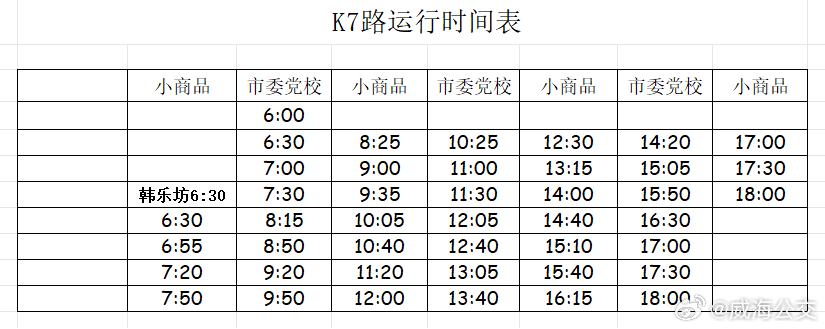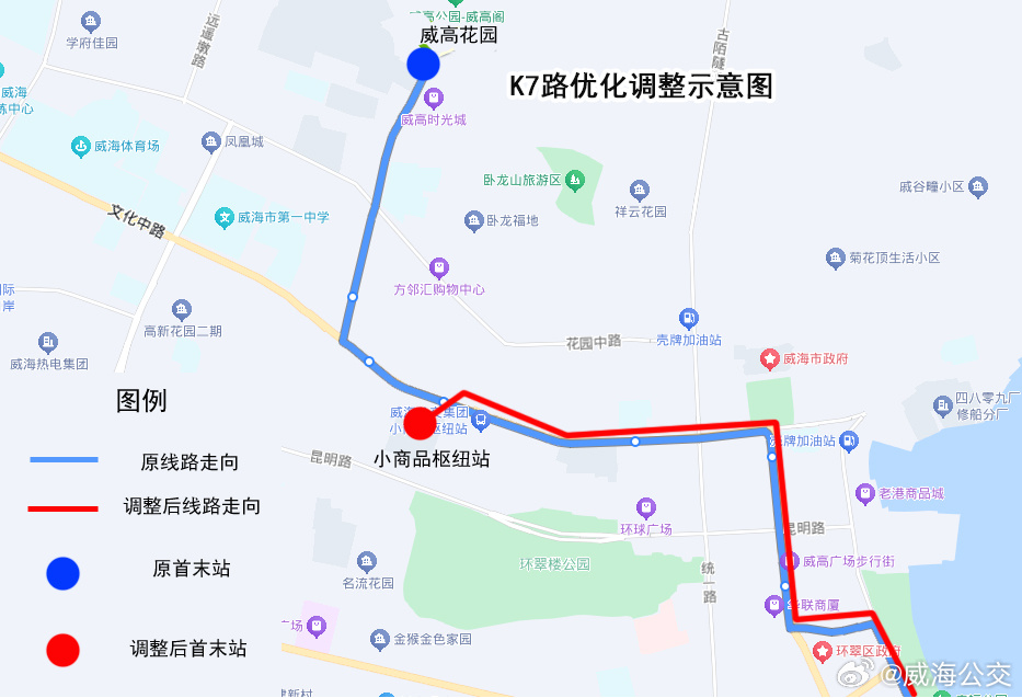調(diào)整后,K7路由市委黨校發(fā)車,按原線路運行至小商品樞紐站,取消威高花園、神道口、市民卡環(huán)翠服務(wù)中心、小商品市場4個站點。