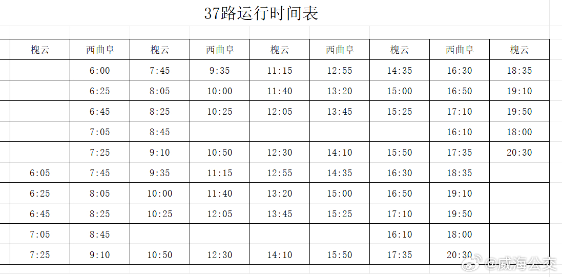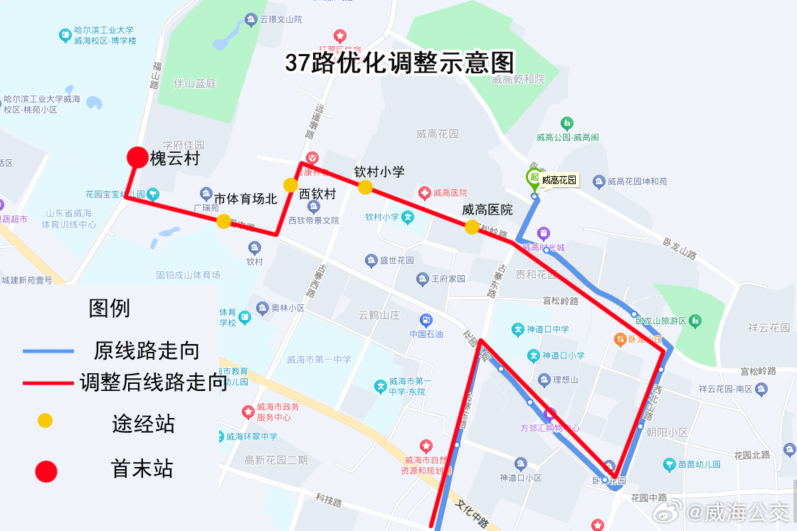 調(diào)整后,37路由西曲阜發(fā)車,按原線路運行至威高時光城站點,改行宮松嶺路、遠(yuǎn)遙墩路、花園中路、福山路至槐云村站點,取消威高花園1個站點,增設(shè)威高醫(yī)院、欽村小學(xué)、西欽村、體育場北、槐云村5個站點。