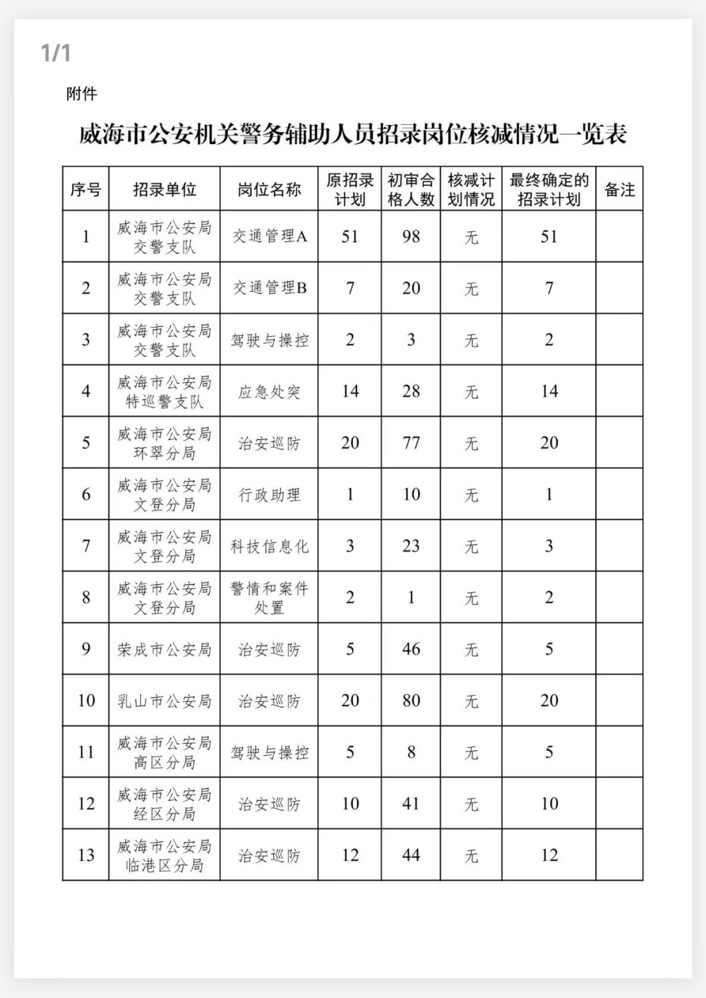 附件:威海市公安機關(guān)警務(wù)輔助人員招錄崗位核減情況一覽表