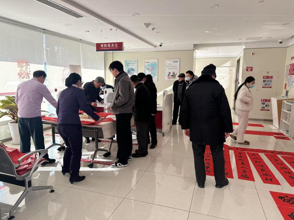 為弘揚(yáng)中華民族優(yōu)秀傳統(tǒng)文化,營(yíng)造溫馨祥和的節(jié)日氛圍,1月21日,青島銀行威海高區(qū)支行在廳堂開(kāi)展以“筆墨凝香送萬(wàn)福 情暖萬(wàn)家迎新春”為主題的公益服務(wù)活動(dòng),邀請(qǐng)威海市書(shū)法家協(xié)會(huì)副會(huì)長(zhǎng)及會(huì)員到廳堂書(shū)寫(xiě)新春的祝福與寄語(yǔ)贈(zèng)予我行新、老客戶(hù)。
