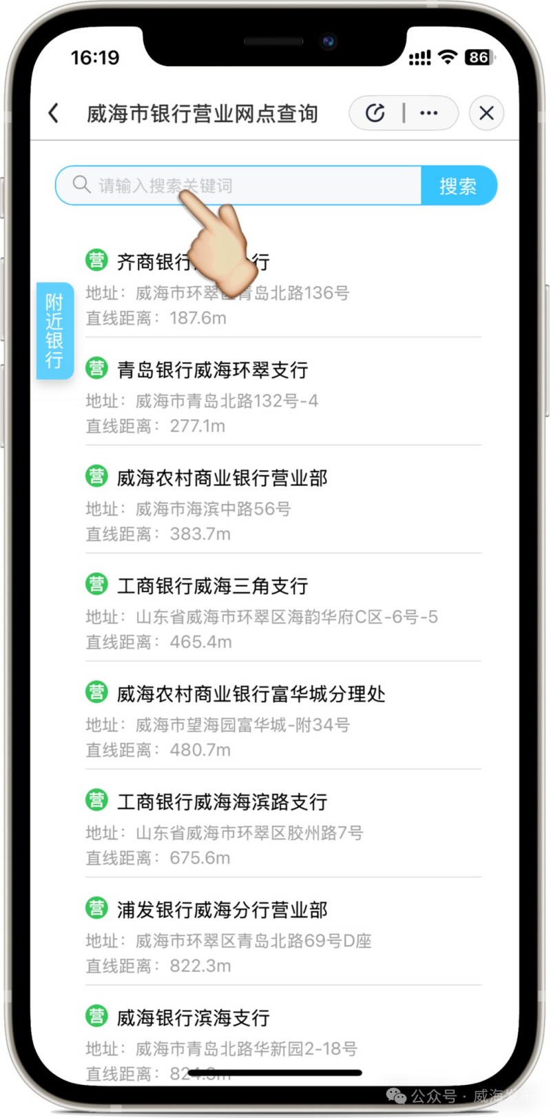 進入“愛山東”APP后,在首頁左上角選擇進入“威海市”,在搜索框搜索關鍵詞“銀行營業(yè)網點”,點擊進入應用。