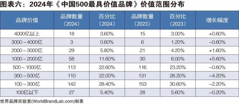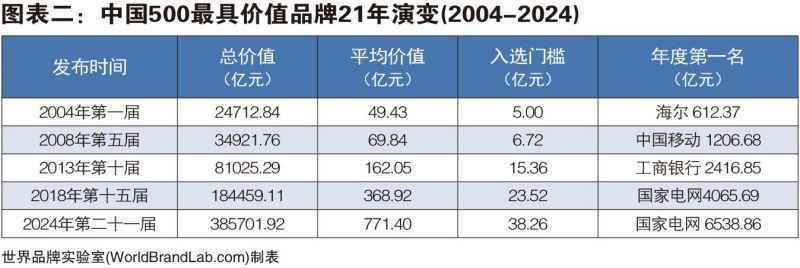 2024年《中國(guó)500最具價(jià)值品牌》的總價(jià)值為38.57萬(wàn)億元,比去年增加4.24萬(wàn)億元,增幅為12.35%。世界品牌實(shí)驗(yàn)室學(xué)術(shù)委員會(huì)主席、牛津大學(xué)(Oxford)營(yíng)銷學(xué)榮譽(yù)教授斯蒂芬·沃格(Steve Woolgar) 博士表示:“在過去的20多年中,我目睹了中國(guó)品牌的快速成長(zhǎng),有的已經(jīng)具有強(qiáng)大的世界影響力,這些品牌包括國(guó)家電網(wǎng)、海爾、中化、華潤(rùn)、中國(guó)南方電網(wǎng)、保利、河鋼、中國(guó)華電、五糧液、徐工、青島啤酒、中國(guó)國(guó)航、北大荒、東方電氣、通威、波司登、飛鶴、中國(guó)航油、恒力、協(xié)鑫、圣象、九牧、長(zhǎng)虹、雙星輪胎等?!笔澜缙放茖?shí)驗(yàn)室編制中國(guó)品牌報(bào)告已是第21個(gè)年頭,2004年入選門檻僅為5億元,前500名品牌的平均價(jià)值為49.43億元。21年以后的2024年,入選門檻已經(jīng)提高到38.26億元,而前500名品牌的平均價(jià)值高達(dá)771.40億元,增幅為1460.59%。本年度共有108個(gè)中國(guó)品牌的價(jià)值超過1000億,比去年增加36個(gè),彰顯了中國(guó)品牌經(jīng)濟(jì)的繁榮。