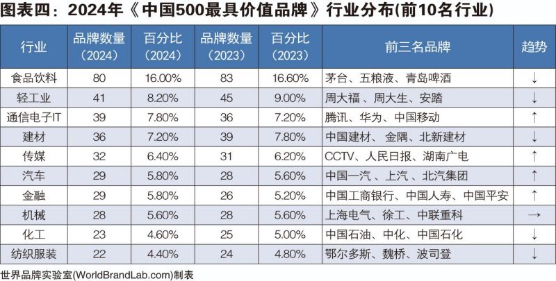 本年度《中國(guó)500最具價(jià)值品牌》排行榜中,共有來自食品飲料、輕工業(yè)、建材、傳媒、紡織服裝、醫(yī)藥、機(jī)械等在內(nèi)的24個(gè)相關(guān)行業(yè)的品牌入選。其中食品飲料業(yè)依然是入選品牌最多的行業(yè),共有80個(gè)品牌入選,占總?cè)脒x品牌數(shù)的16.00%;入選數(shù)量位居第二到第五的行業(yè)分別是輕工(41個(gè))、通信電子IT(39個(gè))、建材(36個(gè))、傳媒(32個(gè))。在衡量品牌的忠誠(chéng)度時(shí),世界品牌實(shí)驗(yàn)室參考了我信品牌(iTrust Rating)的評(píng)級(jí)數(shù)據(jù);在衡量品牌的領(lǐng)導(dǎo)力特別是ESG(環(huán)境、社會(huì)和治理)評(píng)分時(shí),參考了超級(jí)財(cái)經(jīng)(SuperFinance)的ESG數(shù)據(jù)庫(kù)。同時(shí)還借用了低碳國(guó)際(Carboncare International)對(duì)品牌企業(yè)碳排放的計(jì)量,以推動(dòng)品牌添加“碳排放評(píng)分”標(biāo)簽。